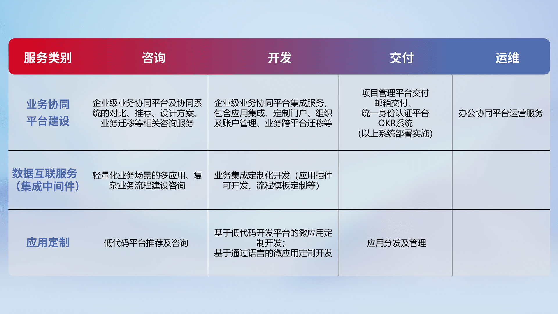 针对钉钉、、、、企微、、、、IDaas等平台级产品提供产品的规划、、、方案、、交付、、定制化开发等服务,,实现如统一协同办公、、、智能客户服务、、、混合会议管理、、、、智能数据查询、、等业务场景,,实现数字化转型。。。。